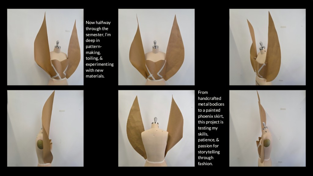 This project has become deeply collaborative, which feels fitting given its theme. My brother Andre will assist with the metal bodice construction, & a group of fellow creatives have offered to help with the phoenix design for the skirt. My plan is to project the phoenix outline onto the fabric, tracing & painting it together as we share stories of growth, recovery, & renewal.
