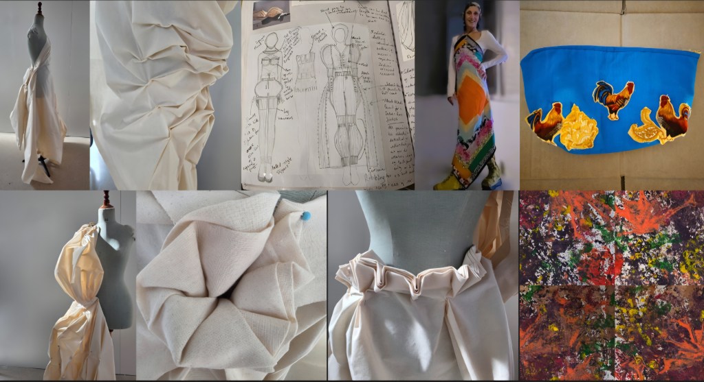 My sketchbook has been growing quickly as ideas develop. I have been exploring silhouettes, experimenting with fabric manipulation & moulage techniques on the mannequin, & generating a wide range of design concepts. Alongside this, I have been learning different textile printing processes including block printing, sublimation printing, & creating laser-cut stencils for fabric printing. Working between digital & physical processes has been particularly exciting.